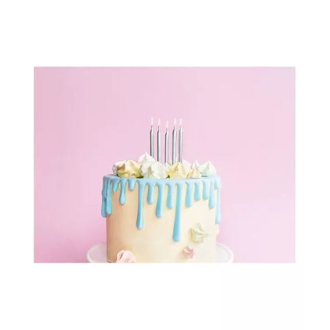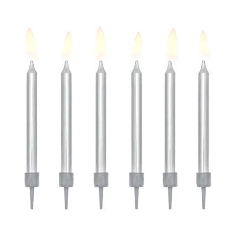 Sada dortových svíček ve stříbrné barvě. Výška svíčky: 6 cm Obsah balení: 6 ks stříbrných svíček