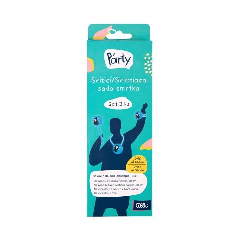Svítící sada smrtka v setu tří kusů, se kterou rozzáříte každou párty! Balení obsahuje tyčinky, které po aktivaci svítí ve tmě, a konektory. Ze sady vyrobíte svítící náhrdelník, hůlku a náramek ozdobené obrázky smrtky. Svítící tyčinky vydrží svítit až 5 hodin! Balení obsahuje: 5× svítící tyčinka (20 cm), 1× svítící hůlka (20 cm), 3× konektor ve tvaru kruhu a 2× konektor (5 mm) Použití: Tyčinku ohýbejte, lámejte a třeste s ní. Může trvat několik okamžiků, než dosáhne plného jasu. Upozornění: Uchovávejte svítící tyčinku v původním obalu, dokud nebude připravena k použití. Vnitřní tyčinka obsahuje sklo. Neprořezávejte ani nepropichujte povrch svítící tyčinky. Chemické látky ve výrobku jsou nehořlavé, ale mohou trvale znečistit nábytek, oblečení a koberce. Po použití svítící tyčinku zlikvidujte v souladu se zákonem o odpadech. Nenechávejte svítící tyčinky na přímém slunci ani je nevystavujte vysokým teplotám. Při zasažení kůže nebo očí důkladně vypláchněte vodou. Složky nezpůsobí poranění očí, ale mohou způsobit dočasné potíže. Nepijte tekutinu ani ji nevkládejte do úst! Vhodné pro děti od 5 let. Doporučuje se dohled dospělé osoby.