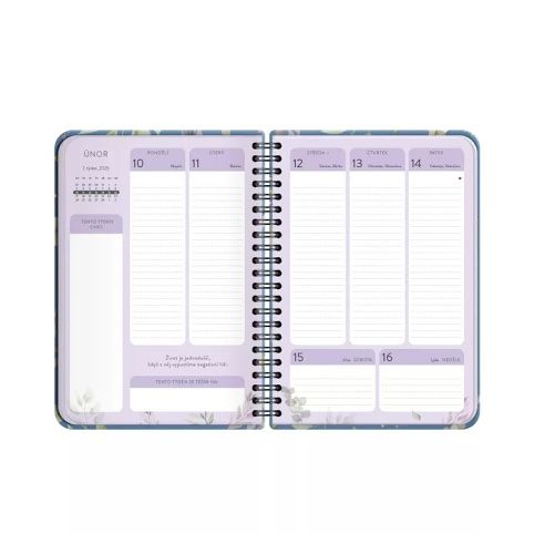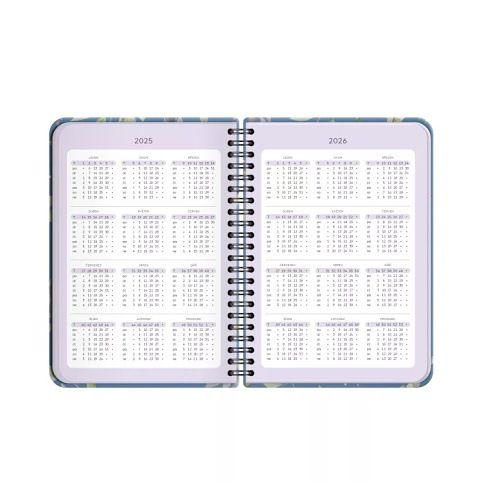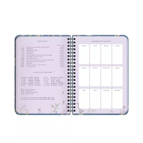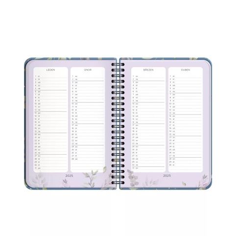 V diářích s květinovými designy je přehled roku 2025 a 2026, měsíční plánovač, státní svátky, astrologický kalendář, narozeninový kalendář a místo pro poznámky. Velikost: A5 Rozměry: 15,5 × 21 × 1,6 cm