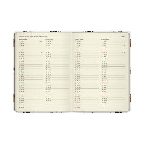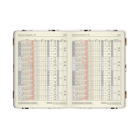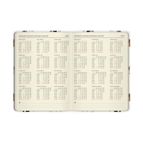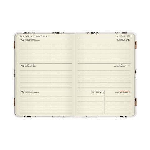 Týdenní diáře mají oblíbené týdenní kalendárium s dostatkem místa pro poznámky. Diáři nechybí stuha jako záložka pro snadnou a rychlou orientaci. Rozměry: 12 cm × 16,8 cm × 1,5 cm