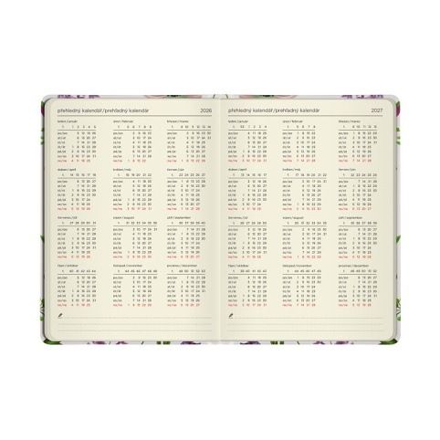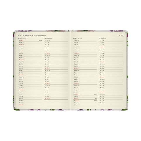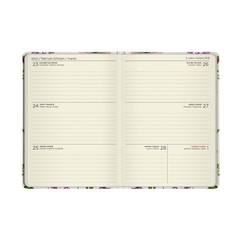 Týdenní diáře mají oblíbené týdenní kalendárium s dostatkem místa pro poznámky. Diáři nechybí stuha jako záložka pro snadnou a rychlou orientaci. Rozměry: 12 cm × 16,8 cm × 1,5 cm