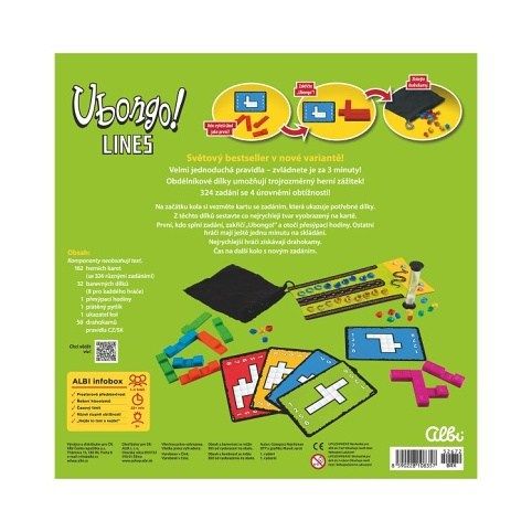 Rodinná hra Ubongo v nové variantě s obdélníkovými trojrozměrnými dílky, 324 zadáními a čtyřmi stupni obtížnosti. Hra obsahuje: 162 herních karet (se 324 zadáními), 32 barevných dílků, 58 drahokamů, 1 přesýpací hodiny, 1 plátený pytlík, 1 ukazatel kol a pravidla CZ/SK.