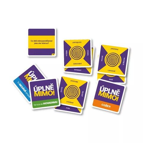 V párty hře Úplně mimo! je úkolem hráčů vytvářet odpovědi na otázky pomocí spojování přídavných a podstatných jmen na kartách.