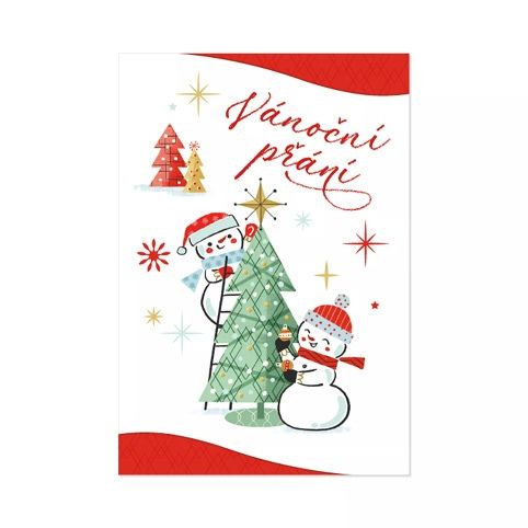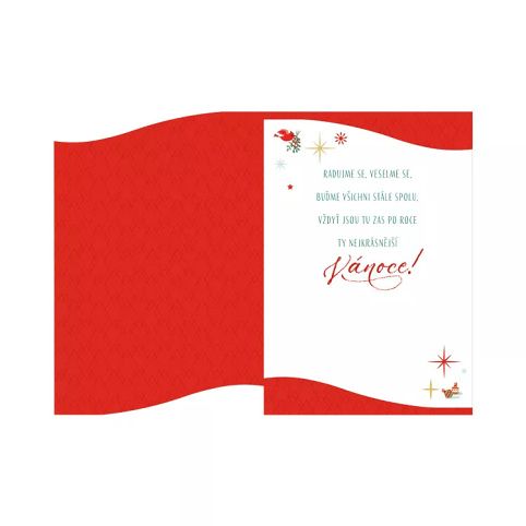 Veselé vánoční přáníčko s milým textem a netradičním tvarem titulní strany Rozměry přání: 13,5 × 19,5 cm Text uvnitř přání: Radujme se, veselme se, buďme všichni stále spolu, vždyť jsou tu zas po roce ty nejkrásnější Vánoce!
