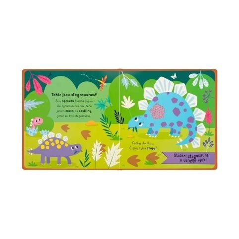 Interaktivní dotyková a zvuková kniha pro děti od 3 let. Každá stránka nabízí hmatové prvky a zvuky dinosaurů. Podporuje rozvoj smyslů a jemné motoriky. Vazba: pevná polstrovaná Počet stran: 12 Rozměry: 21 × 21 × 2 cm