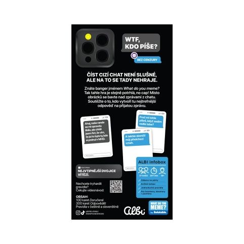 Nekompromisní párty hra o neuvěřitelných konverzacích zabaví všechny od 18 let. Hra WTF, kdo píše? obsahuje: 100 karet Doručené, 300 karet Odpovědět , česká a slovenská pravidla.