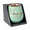 Svícny vyrobené z ručně foukaného skla s milým věnováním zútulní váš domov. Varování: Nedotýkejte se svícnu, pokud v něm hoří svíčka. Sklo je horké! Nevhodné pro styk s nápoji a potravinami.