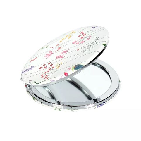Kapesní zrcátko je v jedné půlce zvětšovací, v druhé normální. Rozměry: průměr 7 cm