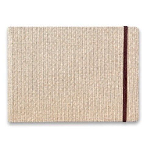 Album Clairefontaine Goldline Natural s rozměry A5 má pevnou látkovou vazbu s pružnou páskou proti otevření. Papír je vhodný na suché i mokré techniky.