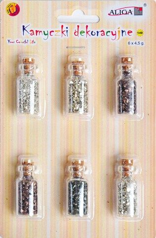 Dekorační kamínky na blistru v ampulkách. Blistr obsahuje 6 barev.