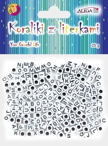 Pytlík 25 g s korálky s potískem písmenek. Korálky 6 x 6 mm. Otvor pro navlékání 3,5 mm. Barva: černo-bílá.