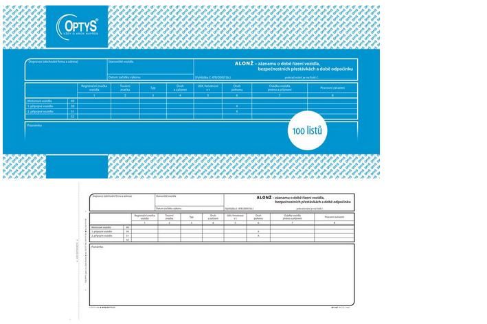 Alonž - záznamu o době řízení vozidla, bezpenostních přestávkách a době odpočinku k záznamu Optys 1166. Formát 1/2 A4 na šířku, nepropisovací, nečíslovaná. Blok obsahuje 100 listů.