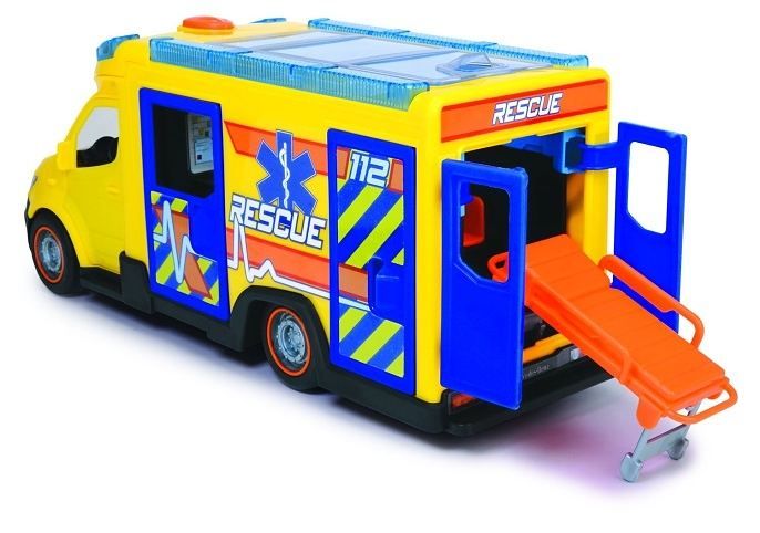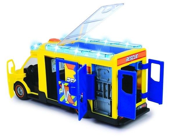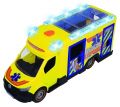 Ambulance na volnoběh, světelný a zvukový efekt, otevírací dveře a střecha, interiér, lehátko a další příslušenství. Délka 34,5 cm.