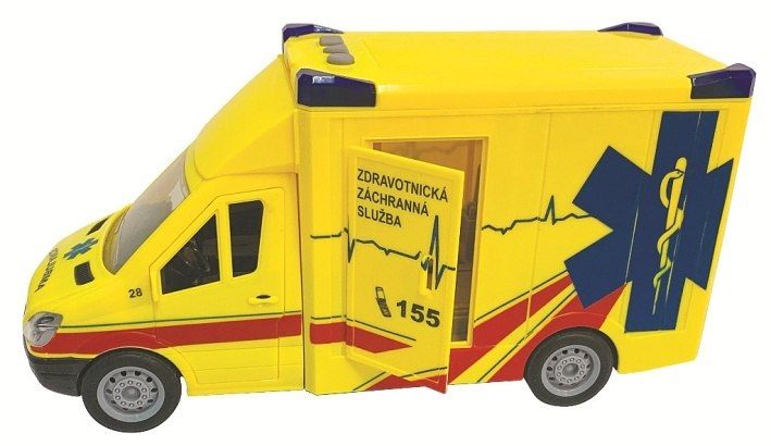 AMBULANCE (setrvačník) tlačítka pro zvukové a světelné efekty, jízda vpřed na setrvačník, otevírací dveře, odnímatelná střecha, funkce „ZKUS MĚ“ Aktivace funkce ZKUS MĚ: Vyjměte pojistku ze zásobníku baterií, kterou naleznete ve dveřích na boku vozu a vyzkoušejte funkce stiskem tlačítek, umístěných na jeho střeše Použijte 2× baterie ""AA/LR6"" 1,5V. Baterie jsou součástí balení – pouze pro zkušební provoz.