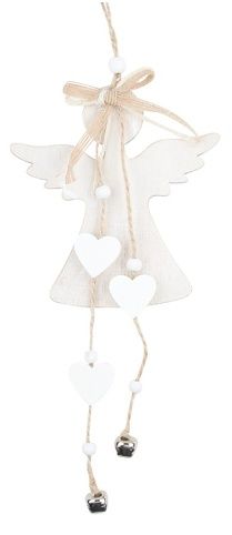 Dekorace na zavěšeníLátková mašleRolničkyDřevěné detailyVánoční dekorace na zavěšení ve tvaru anděla v bílé barvě. Andílka ze dřeva zdobí látková mašlička, dřevěný korálek na šňůrce a dva provázky s dřevěnými srdíčky a korálky, zakončené rolničkou.
