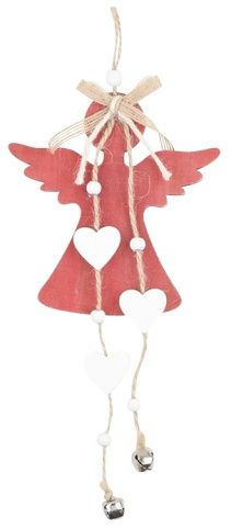 Dekorace na zavěšeníLátková mašleRolničkyDřevěné detailyVánoční dekorace na zavěšení ve tvaru anděla v červené barvě. Andílka ze dřeva zdobí látková mašlička, dřevěný korálek na šňůrce a dva provázky s dřevěnými srdíčky a korálky, zakončené rolničkou.