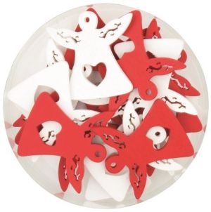 Anděl dřevěný s lepíkem 4,5 cm, červený a bílý, 16 ks v krabičce