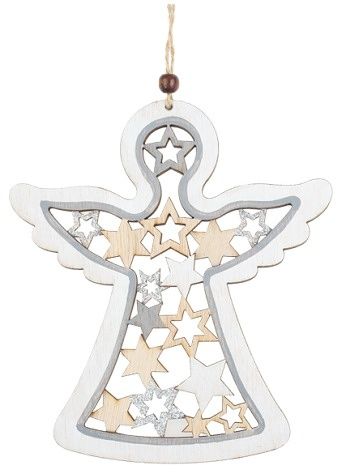 Dekorace na zavěšeníVyřezávané detailyDřevoVánoční dekorace na zavěšení ve tvaru anděla s šedým lemováním a hvězdami. Některé jsou bílé, jiné šedé a na některých z nich najdete stříbrný glitr, který krásně navodí třpyt Vánoc.