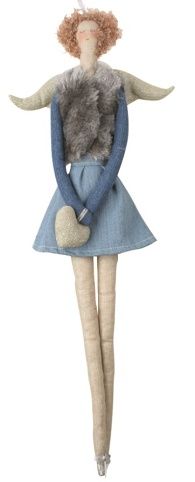 Andělka látková na zavěšení, ve džínovém a šedé vestě 43 cm