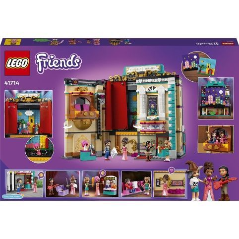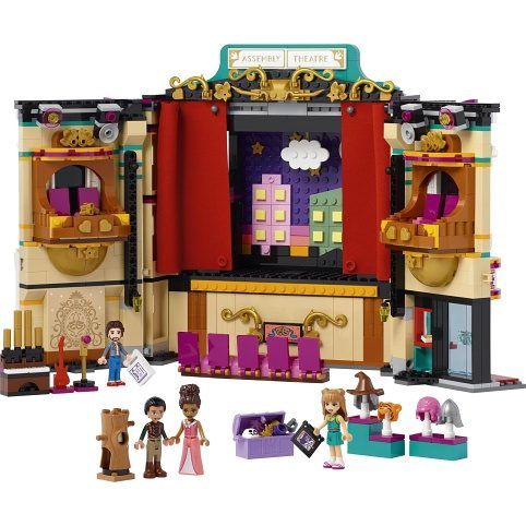 Za viktoriánskou fasádou se ukrývá divadlo, včetně předních křesel v přízemí a balkónu. Odhrňte látkovou oponu a pokochejte se 2 scenériemi – středověkým hradem a nočním městem. Otočte divadlo a prohlédněte si osvětlovací techniku a šatnu, kde se postavy připravují na vystoupení – úplně jako ve skutečnosti! Nechybí ani rekvizity, s nimiž si děti budou moct vymýšlet vlastní dramatické scény. Kamarádky LEGO® Friends Andrea, Ollie a Freya mohou pilovat své herecké party pod vedením profesora Adriana.