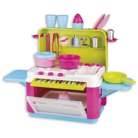 Cestovní pultová kuchyňka s dvěma bočními, nosnými, odnímatelnými deskami, vyrobená z kvalitních plastů v Itálii. Obsahuje: sadu příborů pro 4 děti, zásuvku na příbory, troubu s plechem, varnou desku, mycí dřez s baterií, tři hrnce, dvě sklenice, dva talířky, dvoje kleště, slánku, pepřenku a 2x cupcake. Rozměry ve složeném stavu: výška 41 cm, délka 28,5 cm, šířka 28,5 cm. Váha: 3 kg. Doporučený věk od 36 měsíců. Výrobce, italská firma Androni Giocattoli sídlící nedaleko Milána, se specializuje na výrobu plastových hraček na písek a zahradu a také stavebnic UNICO Plus již od roku 1974. Jejím mottem je heslo: Androni Toys: Kvalita vyrobená v Itálii. Používané plasty jsou pevné, ale zároveň pružné a při běžném hraní nedochází k jejich praskání. Vydrží i větší zátěž a proto jsou výrobky vhodné i do školek, kde téměř denně procházejí zatěžkávací zkouškou.