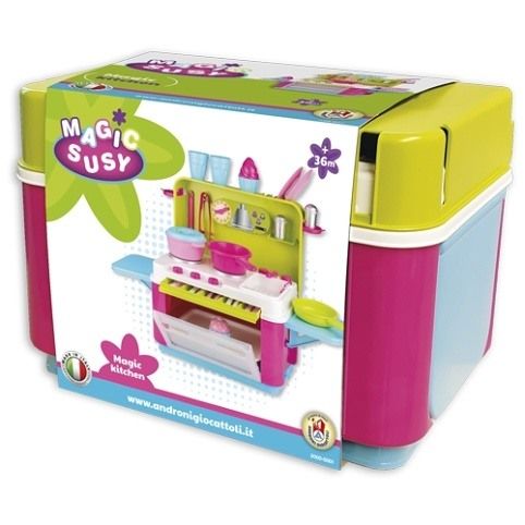 Cestovní pultová kuchyňka s dvěma bočními, nosnými, odnímatelnými deskami, vyrobená z kvalitních plastů v Itálii. Obsahuje: sadu příborů pro 4 děti, zásuvku na příbory, troubu s plechem, varnou desku, mycí dřez s baterií, tři hrnce, dvě sklenice, dva talířky, dvoje kleště, slánku, pepřenku a 2x cupcake. Rozměry ve složeném stavu: výška 41 cm, délka 28,5 cm, šířka 28,5 cm. Váha: 3 kg. Doporučený věk od 36 měsíců. Výrobce, italská firma Androni Giocattoli sídlící nedaleko Milána, se specializuje na výrobu plastových hraček na písek a zahradu a také stavebnic UNICO Plus již od roku 1974. Jejím mottem je heslo: Androni Toys: Kvalita vyrobená v Itálii. Používané plasty jsou pevné, ale zároveň pružné a při běžném hraní nedochází k jejich praskání. Vydrží i větší zátěž a proto jsou výrobky vhodné i do školek, kde téměř denně procházejí zatěžkávací zkouškou.