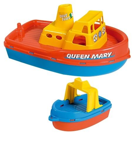 Loď se sirénou - remorkér Queen Mary a malý člun, vyrobená z kvalitních plastů v Itálii. Při stisknutí trupu vydává zvuk sirény. Loď: výška 17 cm, šířka 21 cm, délka 38 cm, malý člun: výška 7 cm, šířka 8 cm, délka 15 cm. Váha setu: 0,65 kg. Baleno v síťce. Doporučený věk od 12 měsíců. Výrobce, italská firma Androni Giocattoli sídlící nedaleko Milána, se specializuje na výrobu plastových hraček na písek a zahradu a také stavebnic UNICO Plus již od roku 1974. Jejím mottem je heslo: Androni Toys: Kvalita vyrobená v Itálii. Používané plasty jsou pevné, ale zároveň pružné a při běžném hraní nedochází k jejich praskání. Vydrží i větší zátěž a proto jsou výrobky vhodné i do školek, kde téměř denně procházejí zatěžkávací zkouškou.