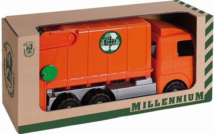 Velké plastové auto popeláři s kontejnerem z řady Millennium v hnědé ekologické krabici. Vyrobené z kvalitních plastů v Itálii. Rozměry balení: 52,5 x 24,5 x 19 cm (d x š x v). Váha: 1,85kg. Doporučený věk od 36 měsíců. Výrobce, italská firma Androni Giocattoli sídlící nedaleko Milána, se specializuje na výrobu plastových hraček na písek a zahradu a také stavebnic UNICO Plus již od roku 1974. Jejím mottem je heslo: Androni Toys: Kvalita vyrobená v Itálii. Používané plasty jsou pevné, ale zároveň pružné a při běžném hraní nedochází k jejich praskání. Vydrží i větší zátěž a proto jsou výrobky vhodné i do školek, kde téměř denně procházejí zatěžkávací zkouškou.
