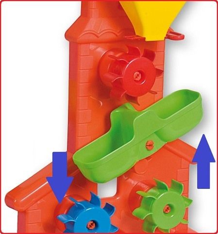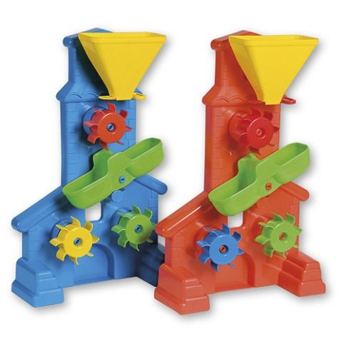 Mlýnek na písek a vodu se třemi lopatkovými koly, dělícím žlábkem a širokou základnou, vyrobený z kvalitních plastů v Itálii. Pohyblivé šoupátko pod násypkou reguluje velikost otvoru, což bádavé děti velmi ocení. Mlýnek: výška 42 cm, šířka základny 27 cm, váha: 0,50 kg. Doporučený věk od 12 měsíců.