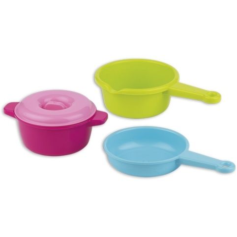 Nádobí na vaření - 3 kusy, vyrobené z kvalitních plastů v Itálii. Obsahuje: pánev, hrnec s poklicí a rendlík. Rozměry balení: 40 x 15 x 8 cm (d x š x v). Baleno v síťce. Doporučený věk od 12 měsíců. Výrobce, italská firma Androni Giocattoli sídlící nedaleko Milána, se specializuje na výrobu plastových hraček na písek a zahradu a také stavebnic UNICO Plus již od roku 1974. Jejím mottem je heslo: Androni Toys: Kvalita vyrobená v Itálii. Používané plasty jsou pevné, ale zároveň pružné a při běžném hraní nedochází k jejich praskání. Vydrží i větší zátěž a proto jsou výrobky vhodné i do školek, kde téměř denně procházejí zatěžkávací zkouškou.