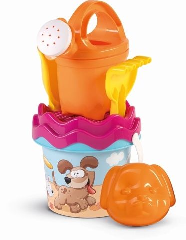 6dílná sada na písek, vyrobená z kvalitních plastů v Itálii. Obsahuje: Kyblík, konvičku 0,5 l, sítko, lopatku, hrabičky a tvořítko ve tvaru psí hlavy. Kyblík: průměr 13 cm, výška 11 cm. Sada: výška 29 cm, váha 0,251 kg. Doporučený věk od 10 měsíců.
