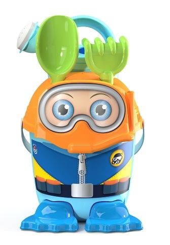 7dílná sada na písek, vyrobená z kvalitních plastů v Itálii. Obsahuje: Kyblík, sítko ve tvaru hlavy potápěče, 2 tvořítka ve tvaru potápěčských ploutví, konvičku, lopatku a hrabičky. Kyblík: průměr 18 cm. Sada: výška 33 cm, váha 0,371 kg. Doporučený věk od 12 měsíců.