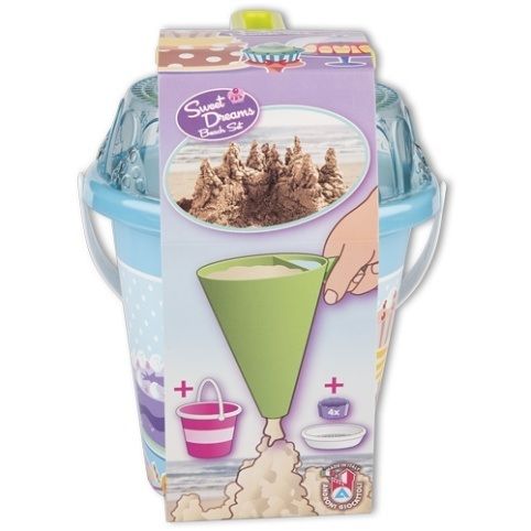 8dílná sada na písek, vyrobená z kvalitních plastů v Itálii. Obsahuje: Kyblík, průhledné sítko ve tvaru dortu, lopatku, 4 tvořítka ve tvaru bábovky a jeden dekoraterský trychtýř pro míchání písku a vody a vytváření kreativních muffinů a jiných výtvorů. Kyblík: průměr 17 cm, výška 16 cm. Sada: výška 22,5 cm, váha 0,43 kg. Doporučený věk od 12 měsíců.