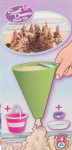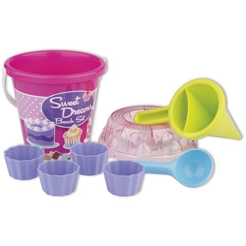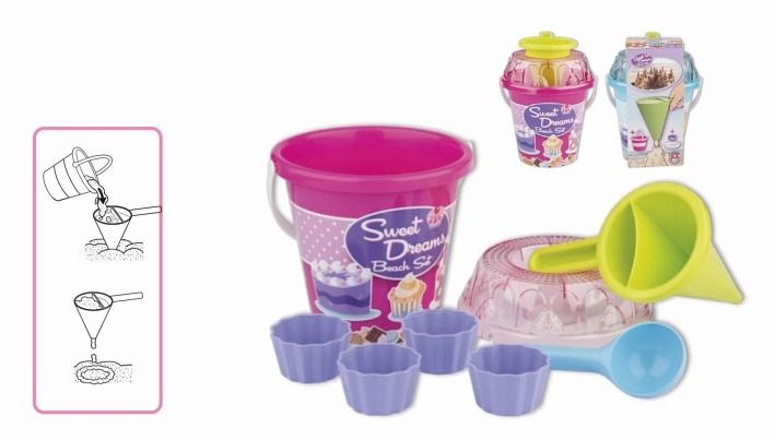 8dílná sada na písek, vyrobená z kvalitních plastů v Itálii. Obsahuje: Kyblík, průhledné sítko ve tvaru dortu, lopatku, 4 tvořítka ve tvaru bábovky a jeden dekoraterský trychtýř pro míchání písku a vody a vytváření kreativních muffinů a jiných výtvorů. Kyblík: průměr 17 cm, výška 16 cm. Sada: výška 22,5 cm, váha 0,43 kg. Doporučený věk od 12 měsíců.