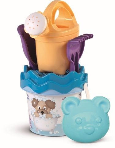 6dílná sada na písek, vyrobená z kvalitních plastů v Itálii. Obsahuje: Kyblík, konvičku 0,5 l, sítko, lopatku, hrabičky a tvořítko ve tvaru psí hlavy. Kyblík: průměr 13 cm, výška 11 cm. Sada: výška 29 cm, váha 0,251 kg. Doporučený věk od 10 měsíců.