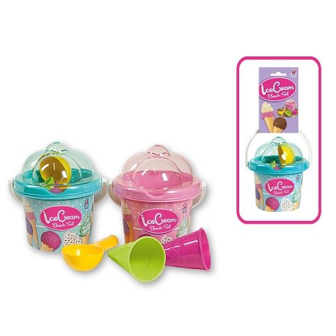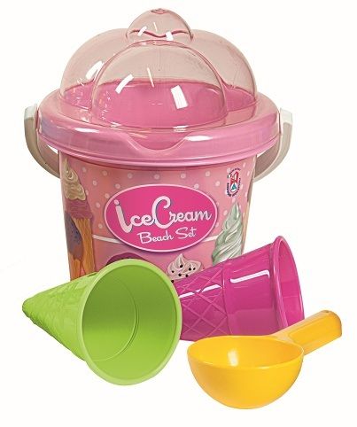 5dílná sada na písek, vyrobená z kvalitních plastů v Itálii. Obsahuje: Kyblík s víkem ve tvaru zmrzlinového poháru, kopečkovač na zmrzlinu a 2 zmrzlinové kornoutky. Kyblík: průměr 13 cm, výška 11 cm. Sada: výška 16 cm, váha 0,26 kg. Doporučený věk od 12 měsíců.