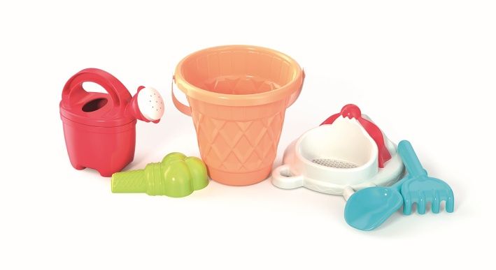 6dílná sada na písek, vyrobená z kvalitních plastů v Itálii. Obsahuje: Kyblík ve stylu kornoutu, sítko v podobě točené zmrzliny, tvořítko ve tvaru zmrzliny se 3 kopečky, konvičku, lopatku a hrabičky. Kyblík: průměr 17 cm, výška 16 cm. Sada: výška 30 cm, váha 0,42 kg. Doporučený věk od 12 měsíců.