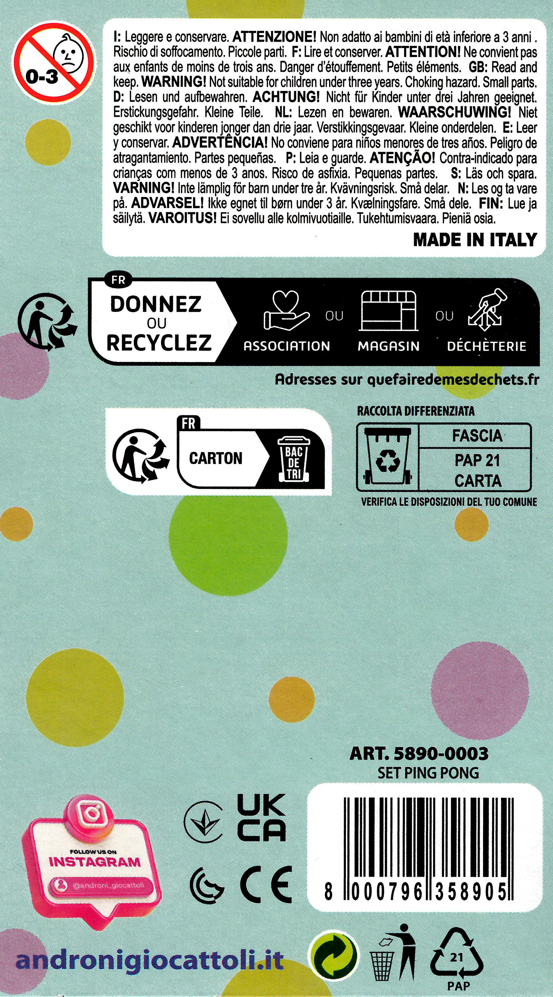 Souprava 2 plastových raket a měkkého míčku. Vyrobeno z kvalitních plastů v Itálii. Velikost rakety 28 cm, průměr 15 cm. Průměr míčku 4 cm. Váha 0,112 kg. Doporučený věk od 36 měsíců.