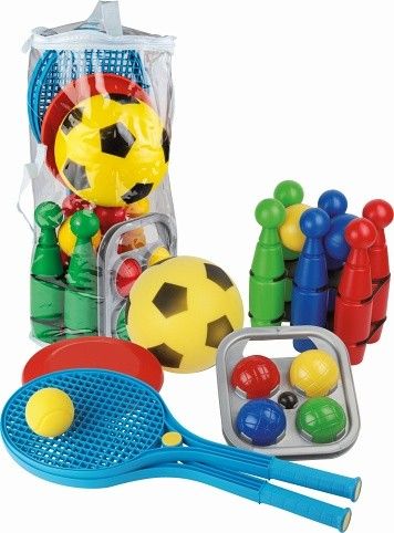 Sportovní sada, vyrobená z kvalitních plastů v Itálii. Obsahuje: měkký míč průměr 20 cm, sadu na líný tenis s míčkem (velikost rakety 54 cm, průměr 21 cm), petanque, létající talíř průměr 22 cm a sadu 6 kuželek se dvěma míčky. Vše je uložené v praktickém batohu se zipem. Rozměry balení: 31 x 31 x 38 cm (d x š x v). Váha sady: 1,8 kg. Doporučený věk od 36 měsíců. Výrobce, italská firma Androni Giocattoli sídlící nedaleko Milána, se specializuje na výrobu plastových hraček na písek a zahradu a také stavebnic UNICO Plus již od roku 1974. Jejím mottem je heslo: Androni Toys: Kvalita vyrobená v Itálii. Používané plasty jsou pevné, ale zároveň pružné a při běžném hraní nedochází k jejich praskání. Vydrží i větší zátěž a proto jsou výrobky vhodné i do školek, kde téměř denně procházejí zatěžkávací zkouškou. zkouškou.