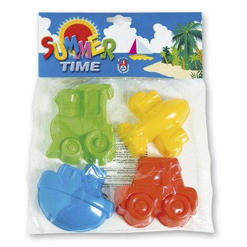 4dílná sada tvořítek na písek: loďka, auto, letadlo, lokomotiva. Vyrobeno z kvalitních plastů v Itálii. Baleno v sáčku o rozměrech 27 x 34 cm. Váha: 0,20 kg. Doporučený věk od 12 měsíců.