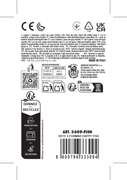 4dílná sada tvořítek na písek: krab, mořská hvězdice, velryba, chobotnice. Vyrobeno v Itálii z kvalitních plastů. Baleno v sáčku o rozměrech 27 x 34 cm. Váha: 0,16 kg. Doporučený věk od 10 měsíců.