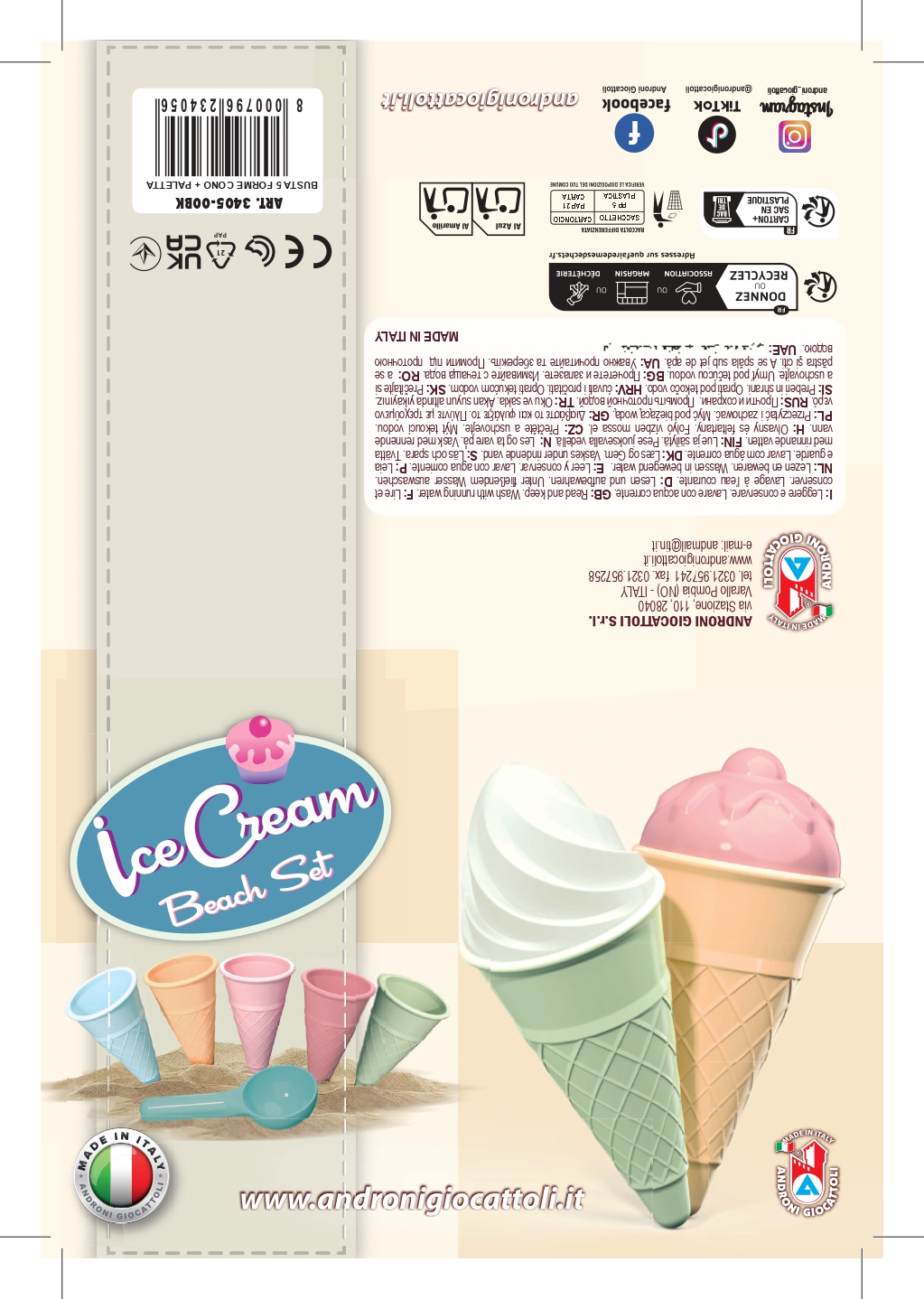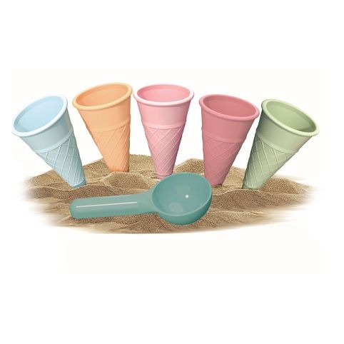6dílná sada tvořítek na písek - zmrzlina. Vyrobeno v Itálii z kvalitních plastů. Obsahuje pět kornoutků a kopečkovač na zmrzlinu. Baleno v sáčku o rozměrech 15 x 31 cm. Váha: 0,114 kg. Doporučený věk od 10 měsíců.