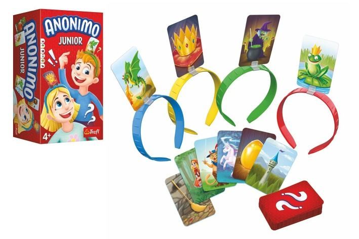 Vstupte do světa bájí a legend! Anonimo junior je společenská hra, při které musí hráči uhádnout, kdo nebo co je na kartách, které mají na hlavě. Nasaďte si čelenku, vytáhněte si kartu s postavou nebo věcí a klaďte chytré otázky tak, abyste co nejrychleji uhádli, kdo nebo co jste. Hra obsahuje: 112 obrázkových karet, 4 čelenky s držáky, návod.