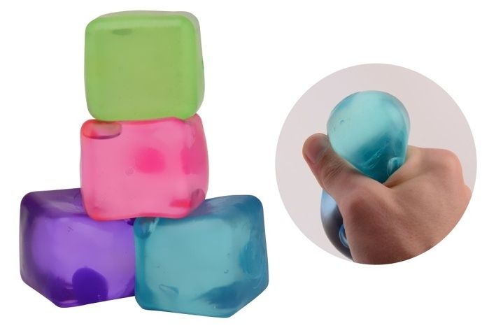 Antistresová rostoucí gelová kostička – mačkej a sleduj jak kostička znova nabývá svůj původní tvar. Ve čtyřech barvách – růžová, modrá, zelená a fialová.