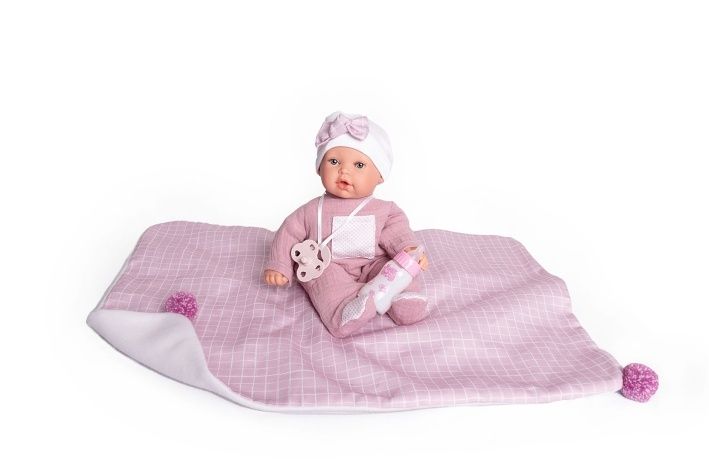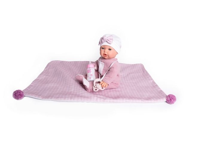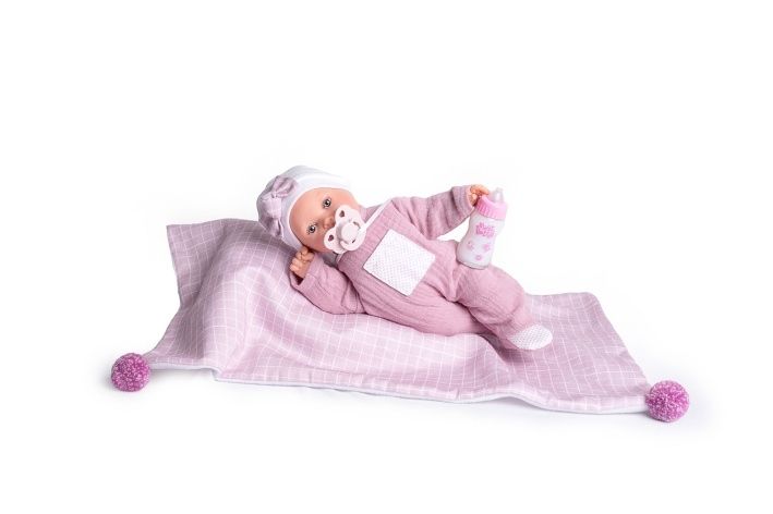 Plačící, ručně vyrobená realistická španělská panenka, reagující na magnetický dudlík. Po vytažení dudlíku z úst vydává reálný zvuk plačícího dítěte, který lze utišit opět dudlíkem. Panenka má měkké látkové tělo, hlava a končetiny jsou vyrobené z kvalitního měkčeného vinylu. Oblečení některých panenek bylo vyrobeno z organické bavlny, která zaručuje výrobu z ručně sbírané, ekologicky bez chemického ošetření pěstované bavlny. Firma Antonio Juan klade velký důraz na ekologii a proto jako první využívá v tomto odvětví zmíněnou bavlnu. Velikost 27 cm. Baleno v dárkové krabici. Doporučený věk od 3 let. Součástí balení je 3 x knoflíková baterie LR44 s návodem na její výměnu. Baterie jsou spotřební zboží a proto jejich vybití není důvodem k reklamaci panenky.