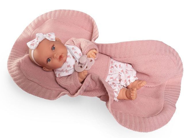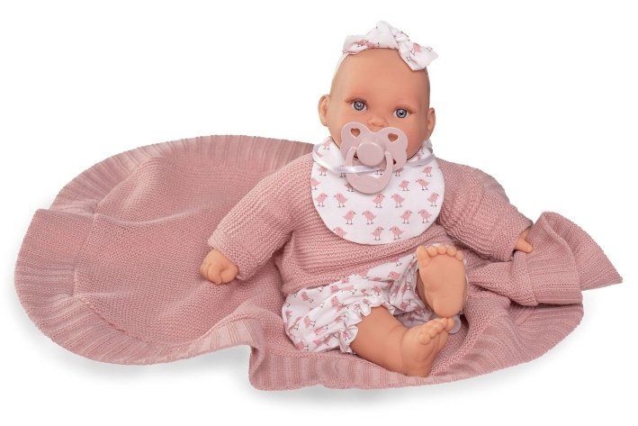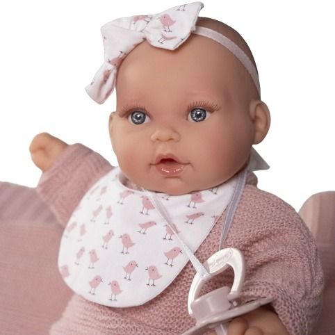 Plačící a mluvící, ručně vyrobená realistická španělská panenka, reagující na magnetický dudlík. Po vytažení dudlíku z úst vydává reálný zvuk plačícího dítěte, který lze utišit opět dudlíkem a říká „mama“, „papa“. Panenka má měkké látkové tělo, hlava a končetiny jsou vyrobené z kvalitního měkčeného vinylu. Oblečení některých panenek bylo vyrobeno z organické bavlny, která zaručuje výrobu z ručně sbírané, ekologicky bez chemického ošetření pěstované bavlny. Firma Antonio Juan klade velký důraz na ekologii a proto jako první využívá v tomto odvětví zmíněnou bavlnu. Velikost 27 cm. Baleno v dárkové krabici. Doporučený věk od 2 let. Součástí balení je 3 x knoflíková baterie LR44 s návodem na její výměnu. Baterie jsou spotřební zboží a proto jejich vybití není důvodem k reklamaci panenky.