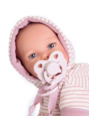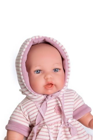 Mluvící, ručně vyrobená realistická španělská panenka. Po zatlačení na bříško začne panenka říkat „mama“, „papa“ a vydávat reálný zvuk smějícího se dítěte. Panenka má měkké látkové tělo, hlava a končetiny jsou vyrobené z kvalitního měkčeného vinylu. Oblečení některých panenek bylo vyrobeno z organické bavlny, která zaručuje výrobu z ručně sbírané, ekologicky bez chemického ošetření pěstované bavlny. Firma Antonio Juan klade velký důraz na ekologii a proto jako první využívá v tomto odvětví zmíněnou bavlnu. Velikost 27 cm. Baleno v dárkové krabici. Doporučený věk od 3 let. Součástí balení je 3 x knoflíková baterie LR44 s návodem na její výměnu. Baterie jsou spotřební zboží a proto jejich vybití není důvodem k reklamaci panenky.