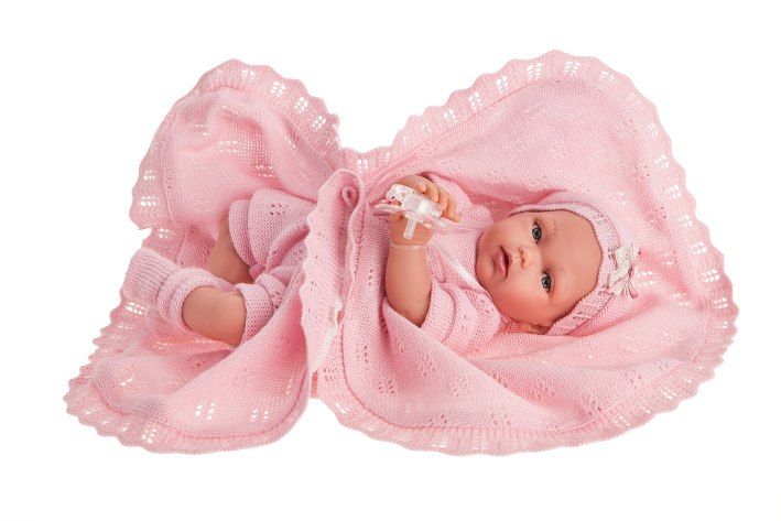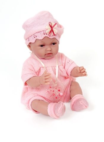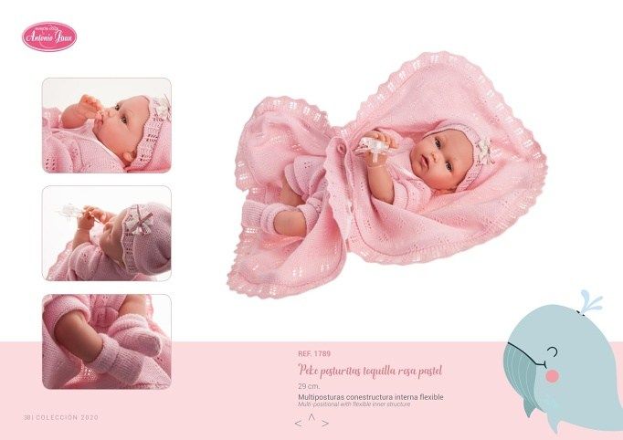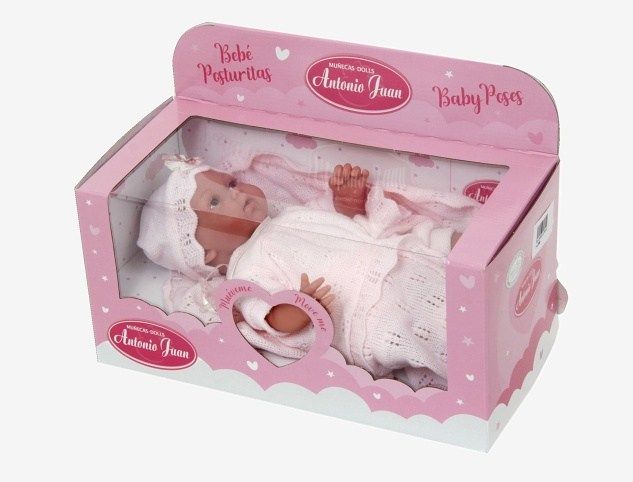 Ručně vyrobená realistická španělská panenka - miminko, se speciální pohybovou funkcí. Díky vnitřní opoře kostry těla, může dělat neobvyklé pohyby končetin, jako překřížit nožičky vleže, dát k sobě dlaně nebo zaujmat různé miminkovské polohy. Miminko má měkké látkové tělo, hlava a končetiny jsou vyrobené z kvalitního měkčeného vinylu. Oblečení panenky bylo vyrobeno z organické bavlny, která zaručuje výrobu z ručně sbírané, ekologicky bez chemického ošetření pěstované bavlny. Firma Antonio Juan klade velký důraz na ekologii a proto jako první využívá v tomto odvětví zmíněnou bavlnu. Velikost 29 cm. Baleno v dárkové krabici. Doporučený věk od 3 let.