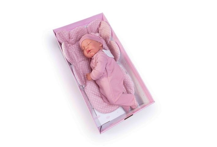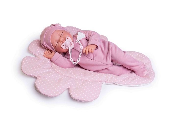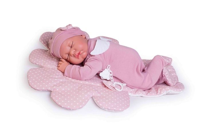 Spící, ručně vyrobená realistická španělská panenka - miminko s realistickými prvky v obličeji a na končetinách. Ruce a nohy jsou k tělu přichycené kloubem s možností polohování, což miminku umožňuje dát si ve spánku třeba ručičky za hlavu. Panenka má měkké látkové tělo, hlava a končetiny jsou vyrobené ze speciálního měkčeného vinylu, příjemného na dotek. Oblečení této panenky bylo vyrobeno z organické bavlny, která zaručuje výrobu z ručně sbírané, ekologicky bez chemického ošetření pěstované bavlny. Firma Antonio Juan klade velký důraz na ekologii a proto jako první využívá v tomto odvětví zmíněnou bavlnu. Velikost 42 cm. Baleno v dárkové krabici. Doporučený věk od 3 let.