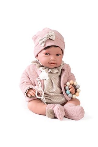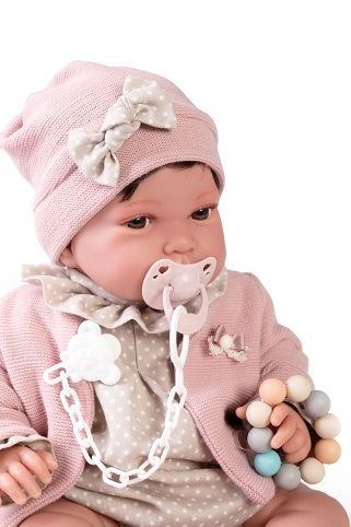 Ručně vyrobená realistická španělská panenka - miminko s realistickými prvky v obličeji a na končetinách. Ruce a nohy jsou k tělu přichycené kloubem s možností polohování, což miminku umožňuje třeba i samostatné sezení bez opory. Panenka má měkké látkové tělo, hlava a končetiny jsou vyrobené ze speciálního měkčeného vinylu, příjemného na dotek. Panenka má vyšší váhu oproti ostatním (1 300g). Oblečení některých panenek bylo vyrobeno z organické bavlny, která zaručuje výrobu z ručně sbírané, ekologicky bez chemického ošetření pěstované bavlny. Firma Antonio Juan klade velký důraz na ekologii a proto jako první využívá v tomto odvětví zmíněnou bavlnu. Velikost 42 cm. Baleno v dárkové krabici. Doporučený věk od 3 let.